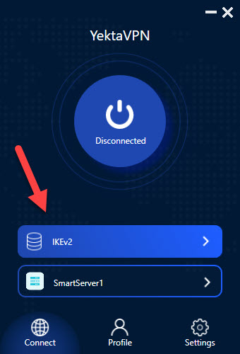از قسمت سرویس گزینه IKEv2 را انتخاب نموده و سپس بر روی اتصال (دابره آبی رنگ) کلیک نمایید و منتظر بمانید تا سرویس متصل شود.