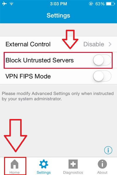 گزینه Block Untrusted Servers را غیرفعال کرده و بر روی Home کلیک کنید.