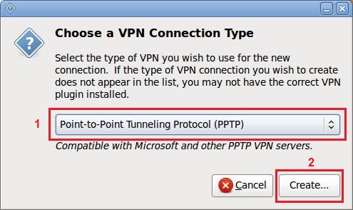 مطابق تصویر زیر PPTP را انتخاب کنید و بر روی Create کلیک کنید.